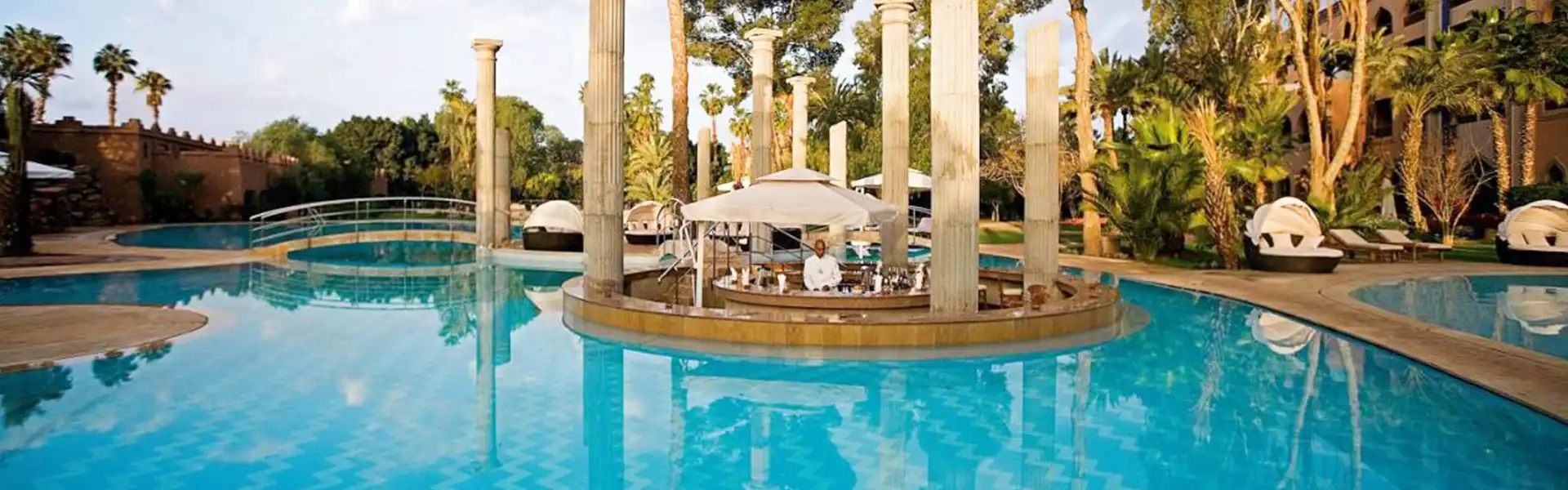 Es Saadi Marrakech Palace Hotel offers executive drinks in 4 bars; Lobby Bar serves fresh juice and other beverages.